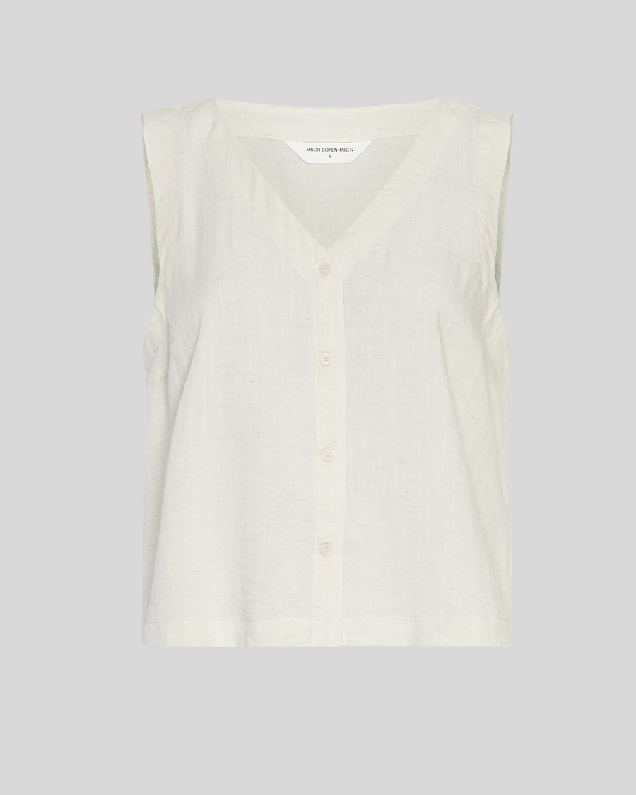Mouwloos shirt van lichtgewicht geweven kwaliteit. Ontworpen met een V-hals en knoopsluiting aan de voorkant. Rechte snit met een subtiele stofstructuur.