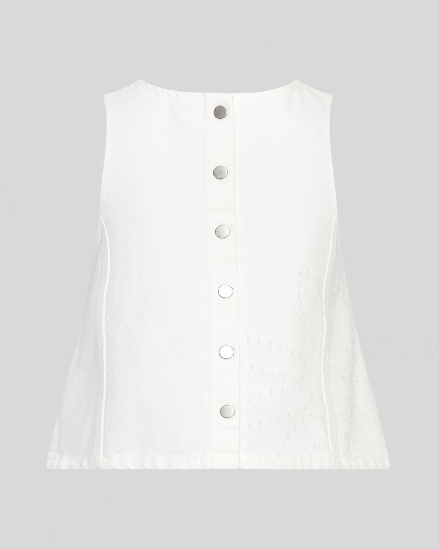 Witte denim top van stevige katoenkwaliteit. Mouwloos model met ronde hals en rechte pasvorm. Afgewerkt met drukknoopsluiting aan de achterkant. Ton-sur-ton borduurdetails aan de voor- en zijkant.