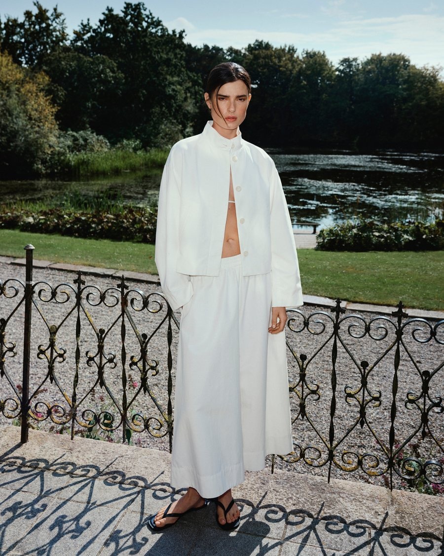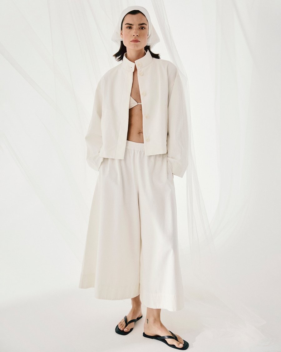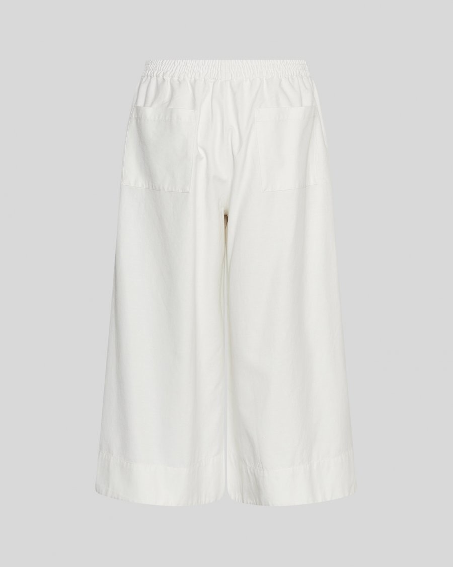 Broek van lichtgewicht geweven stof met een hoge taille, elastische tailleband, wijde pijpen en voorzakken. Door de enkellange pijpen ontstaat een rokachtig silhouet.