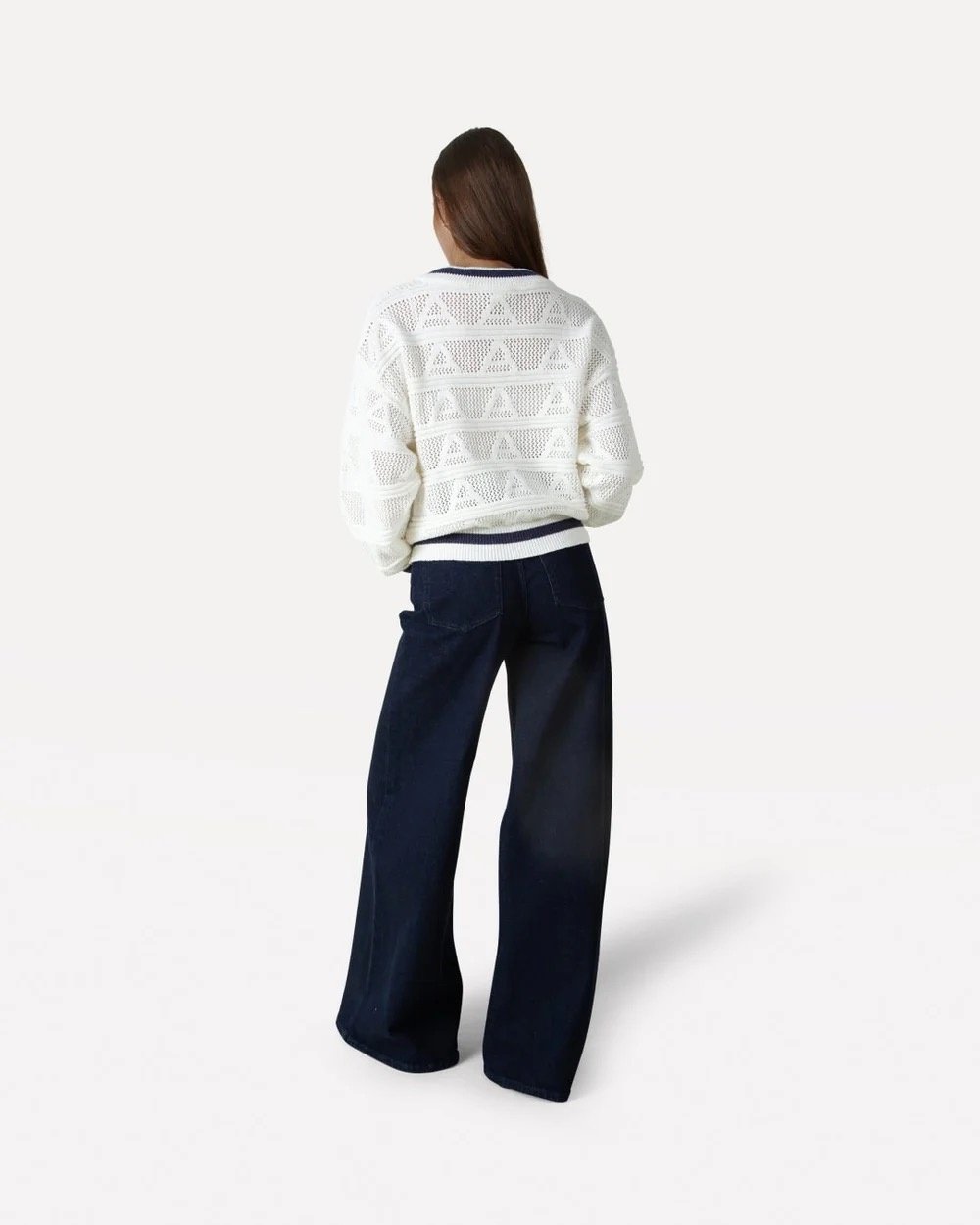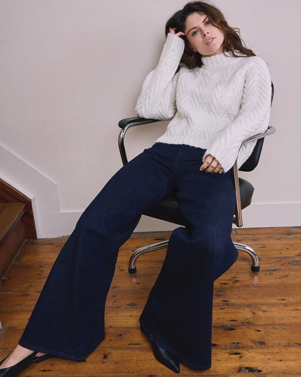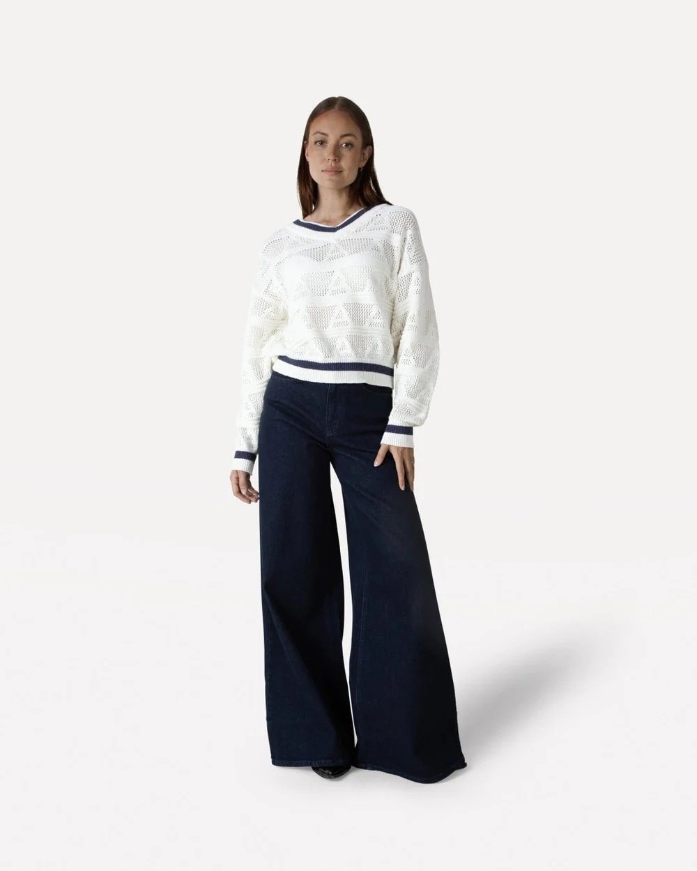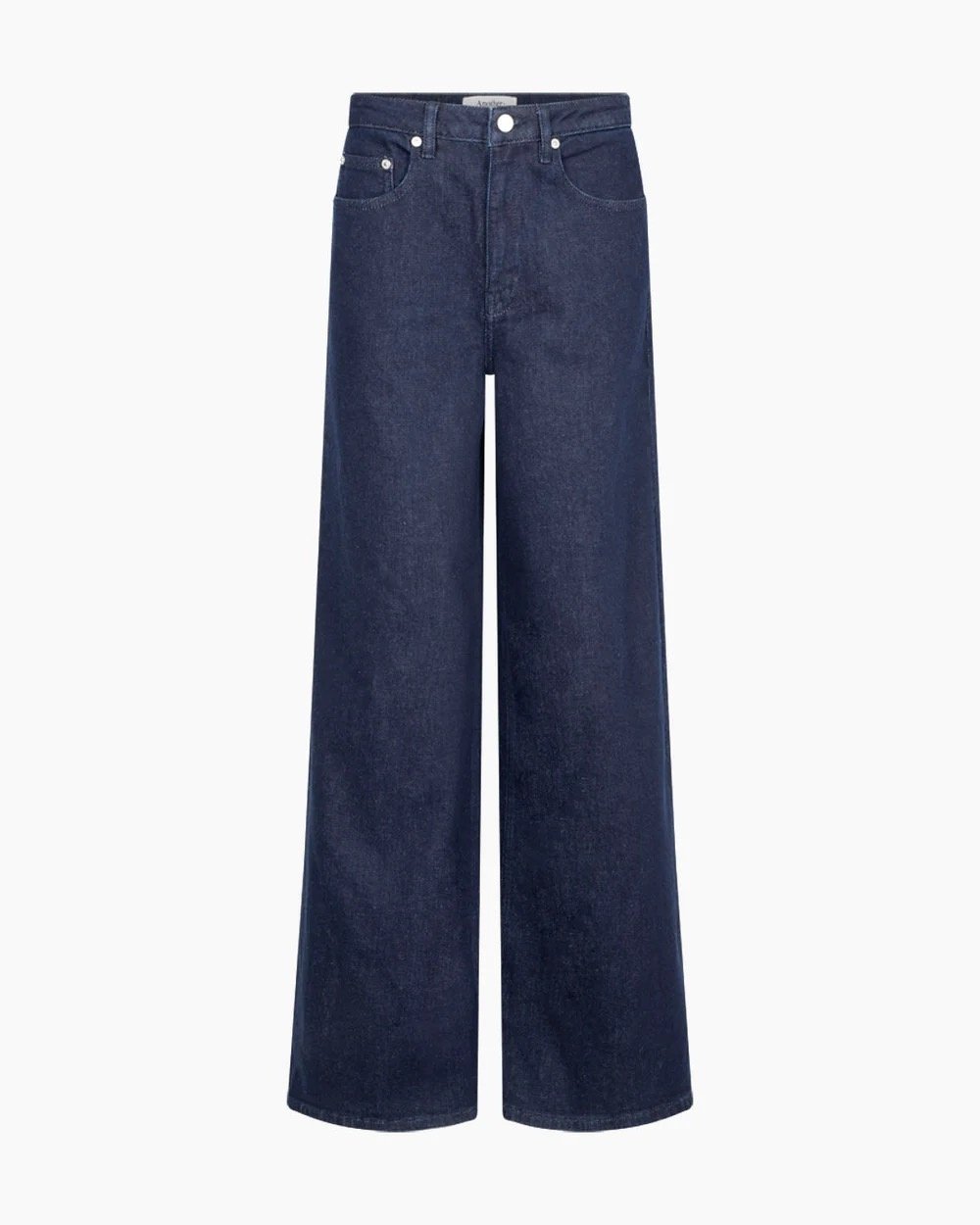 Hoge taille jeans met strijkplooien en hele wijde pijpen met knoopsluiting.