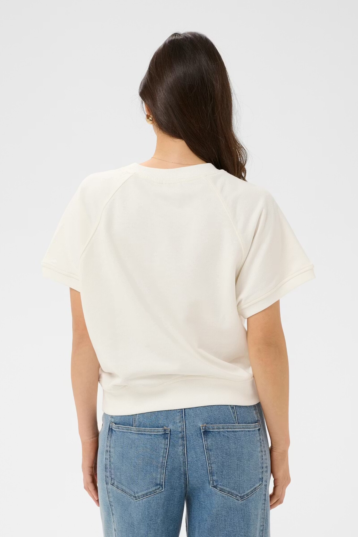 Korte mouwen, klassieke ronde hals en een ruimvallende, relaxte pasvorm. De mouwen zijn wijder uitgesneden en hebben een subtiele omgeslagen boord. De zoom is afgewerkt met een ribboord voor extra stevigheid.