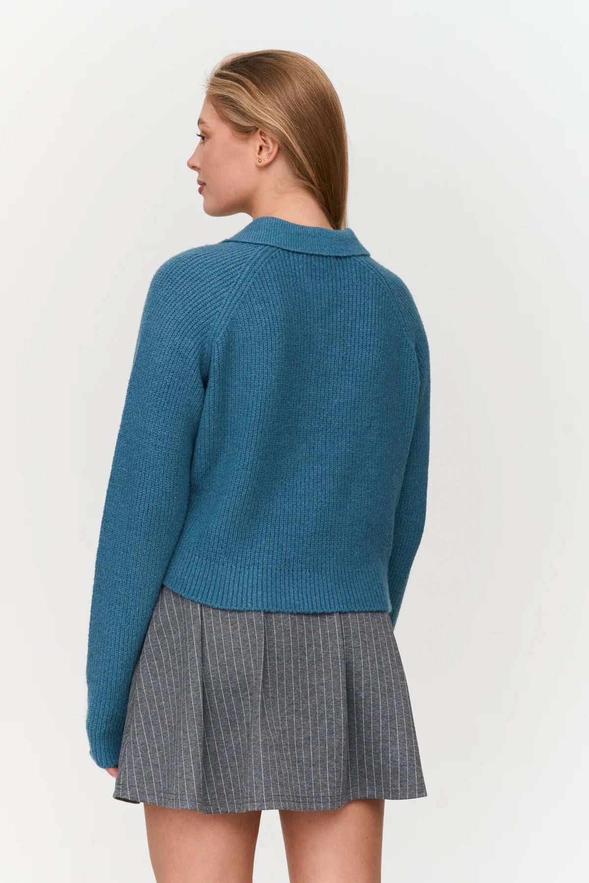 Gebreide trui met knoopsluiting en kraag. Materiaal: 67% acryl, 30% nylon, 3% spandex.