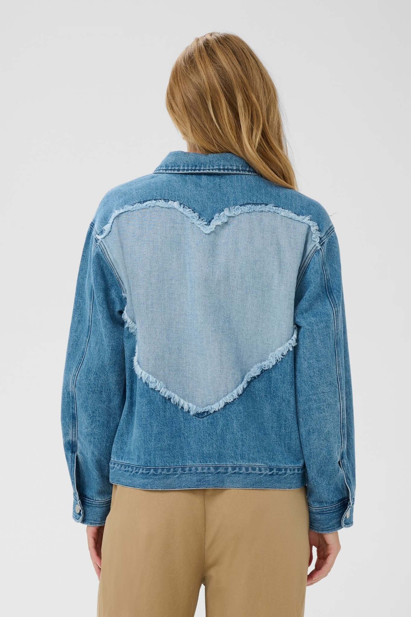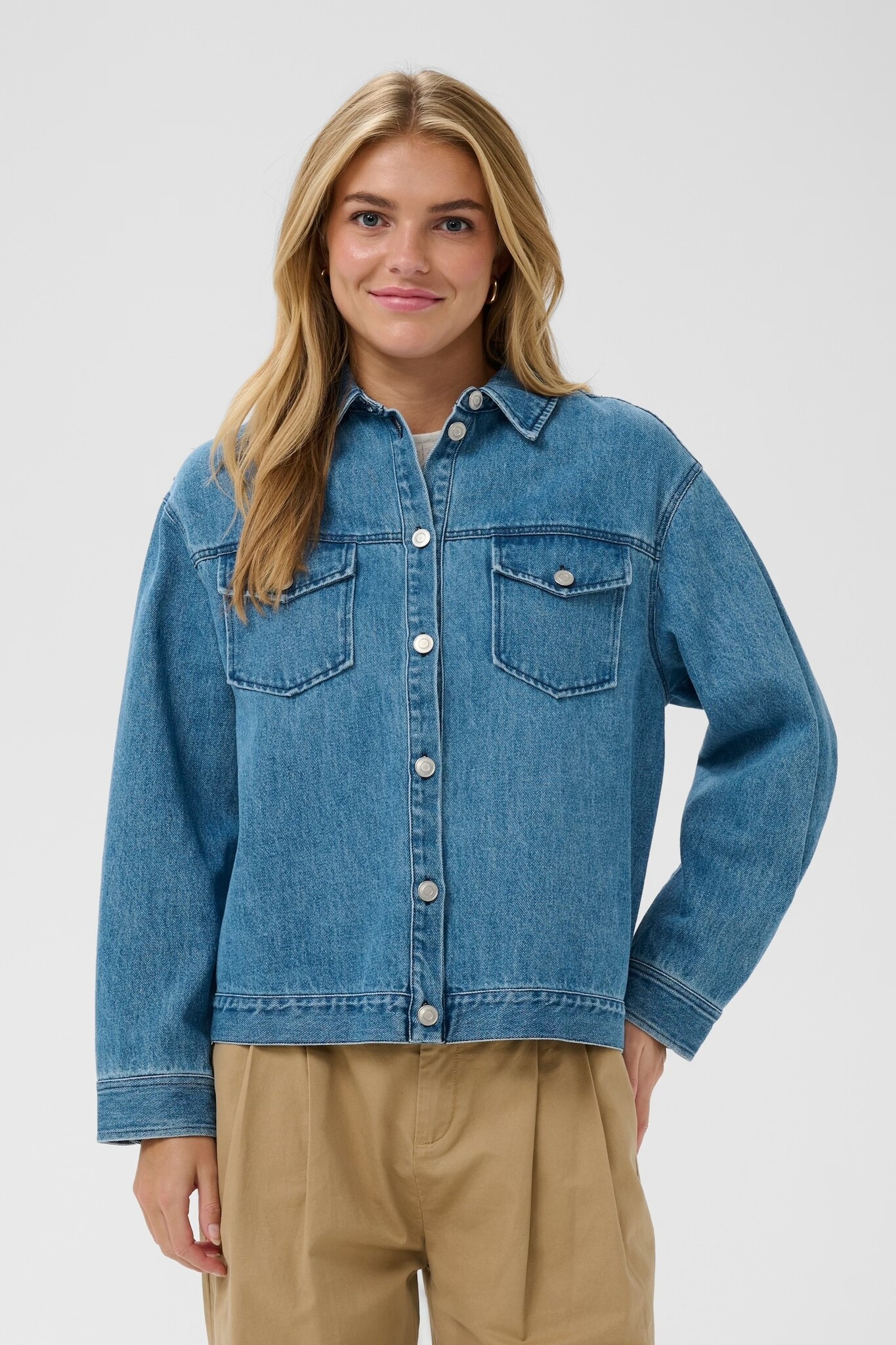 Recht, boxy silhouet met klassieke overhemdkraag en zichtbare metalen knoopsluiting aan de voorkant. 2 klepzakken op de borst met knoopsluiting. De textuur heeft een robuuste, licht gestructureerde afwerking die kenmerkend is voor denim. 100% katoen