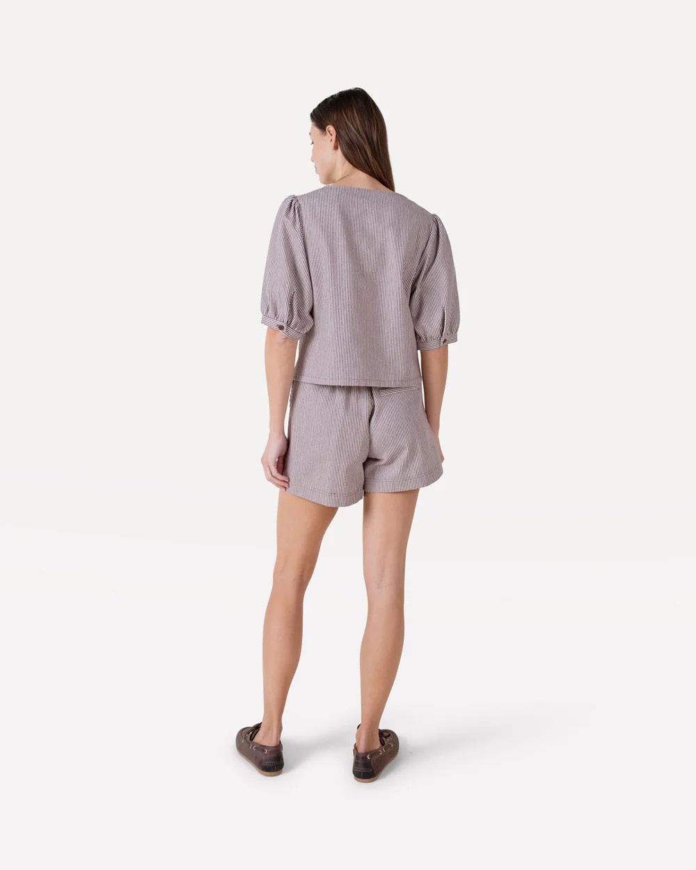 The Romane Stripe Shorts are easy, fresh, and made for warm days. With a mid to high waist and elasticated waistband, they offer comfort with a clean silhouette. The cotton stripe fabric adds a timeless touch, while front pockets keep it practical.