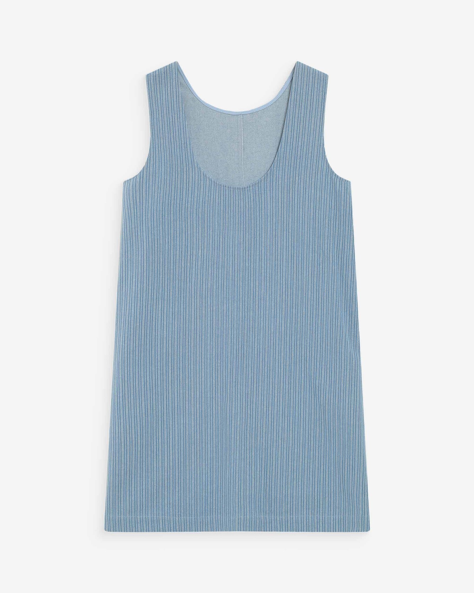 100% katoenen gestreepte denim. De rechte snit en de licht uitgesneden ruguitsnijding van de denimjurk accentueren de vrouwelijke rondingen en flatteren elk figuur.