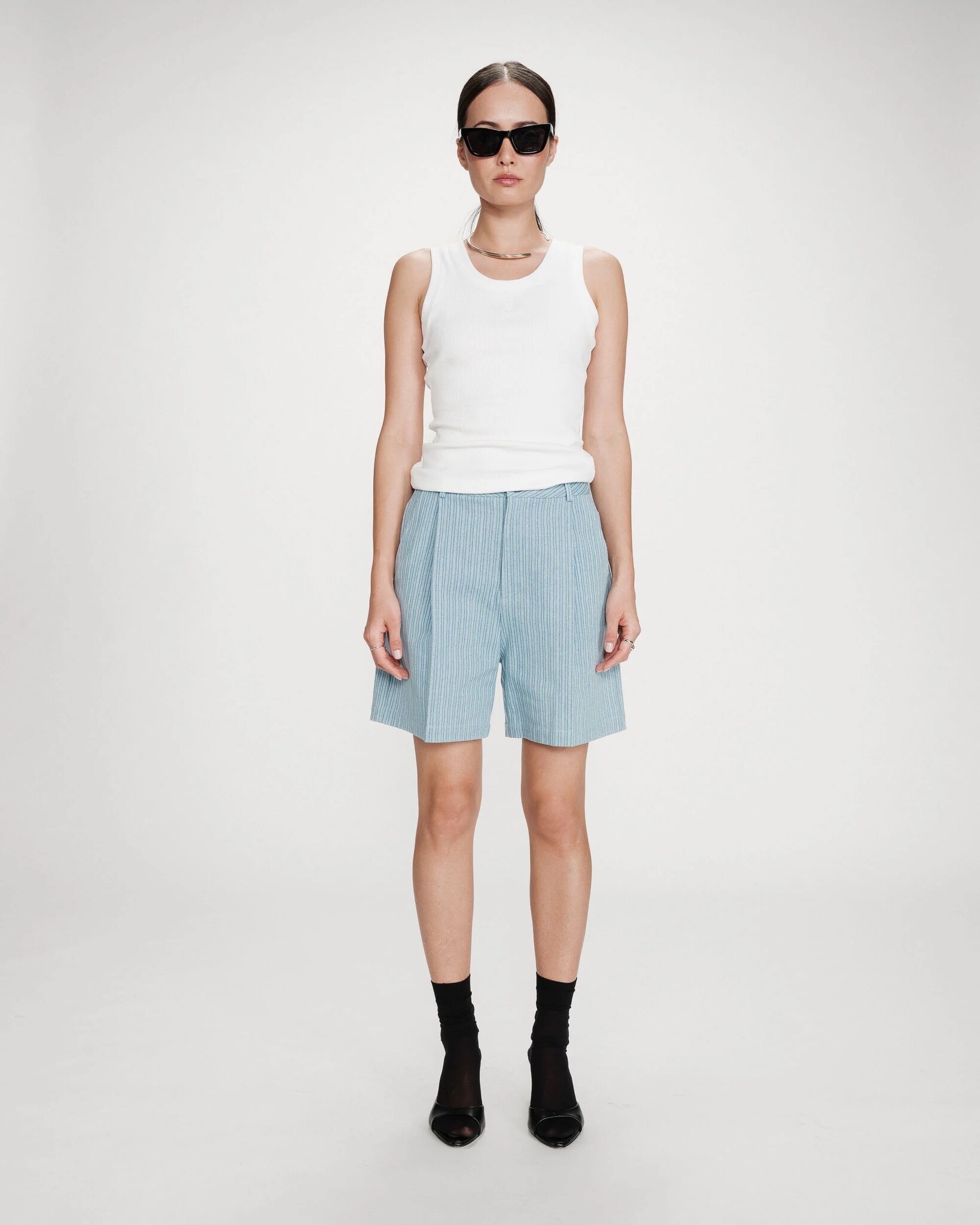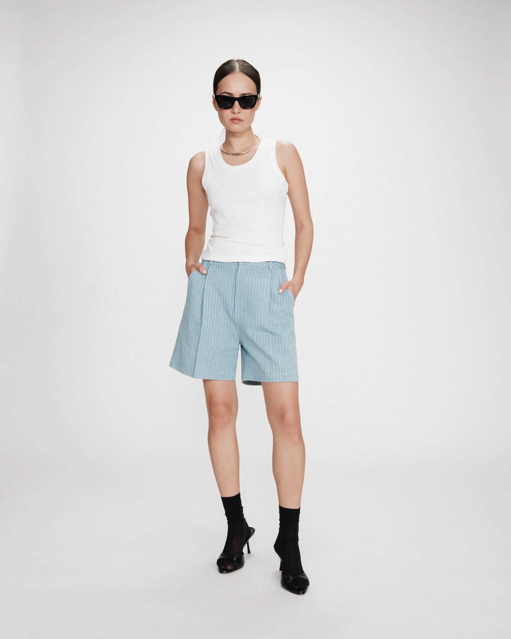 100% katoenen gestreepte denim. De wijde snit en hoge taille zorgen voor een modern, gestructureerd silhouet, terwijl de plooien aan de voorkant een vleugje elegantie toevoegen. Italiaanse zakken aan de voorkant en een ritssluiting met knoop.