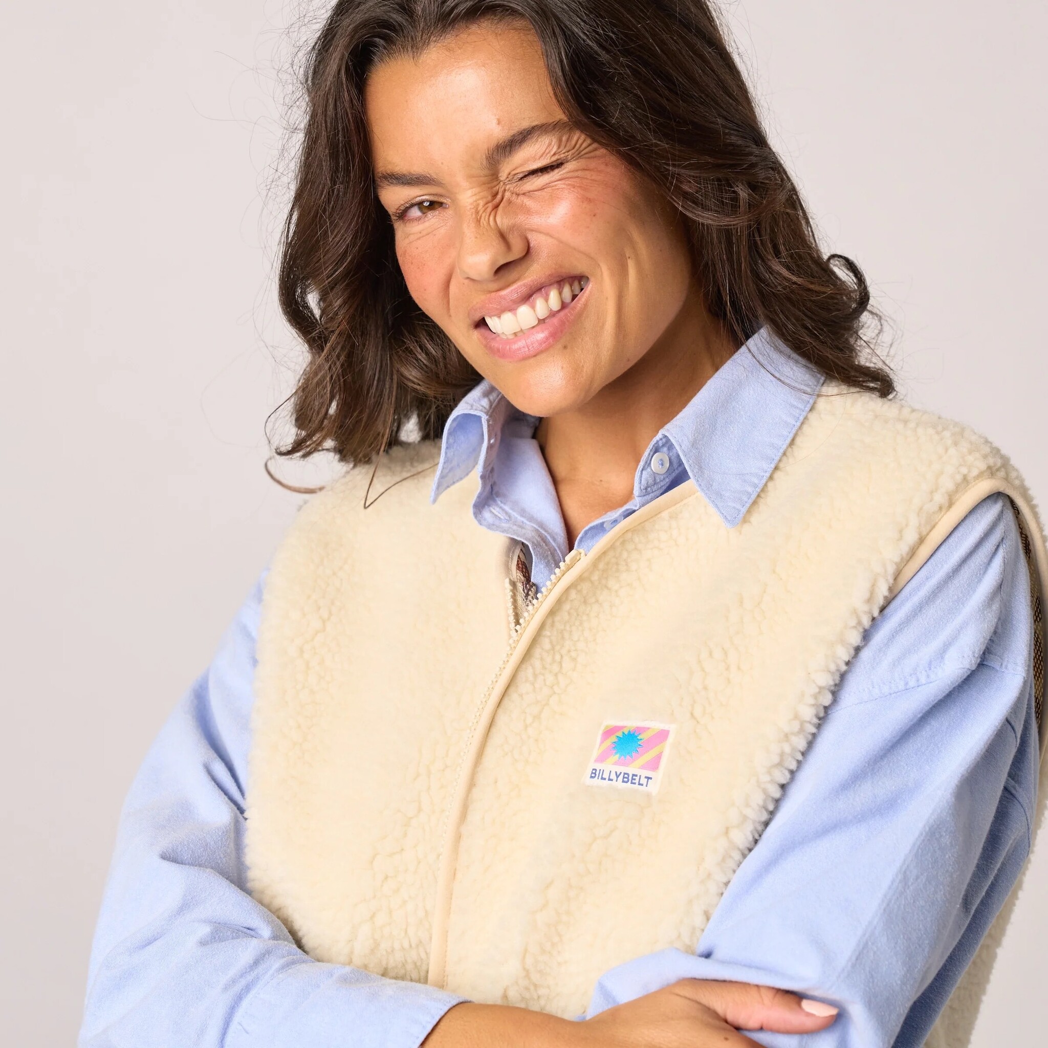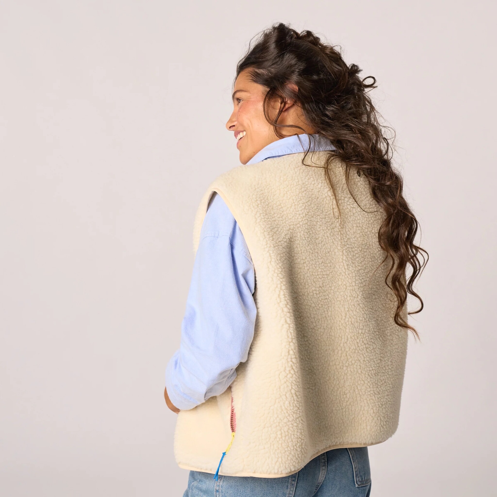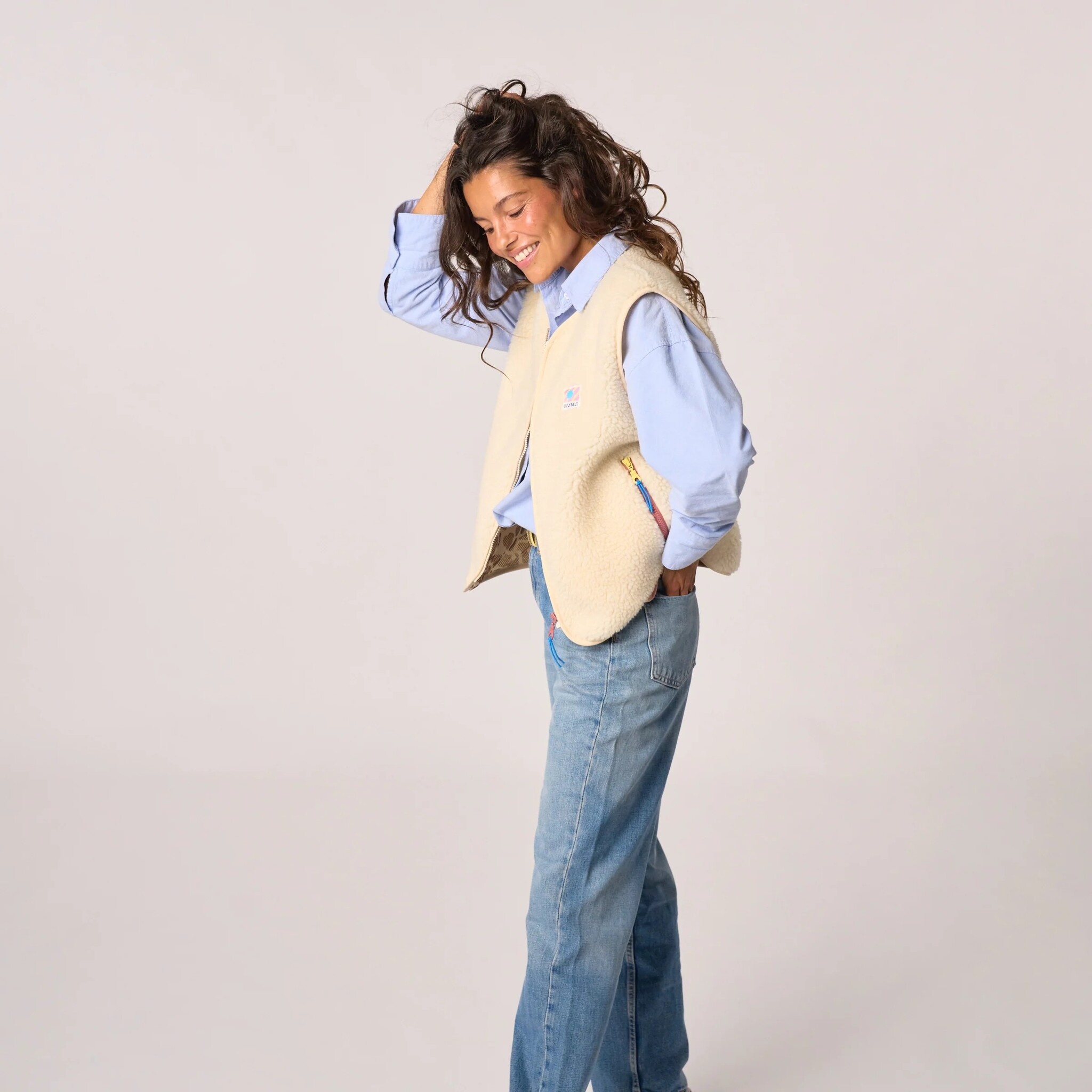 Sherpa jack met rits van gerecycled polyester. Mouwloos, ademend en praktisch met zijzakken