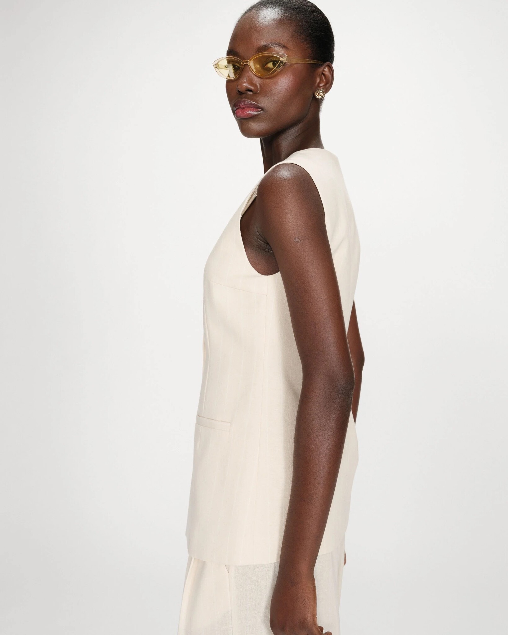 Getailleerde pasvorm en een vierkante halslijn. Het linnen vest van VIC is voorzien van paspelzakken en gegraveerde G&M-knopen aan de voorkant. 30% Viscose, 30% Polyester, 20% Cotton, 20% Linen